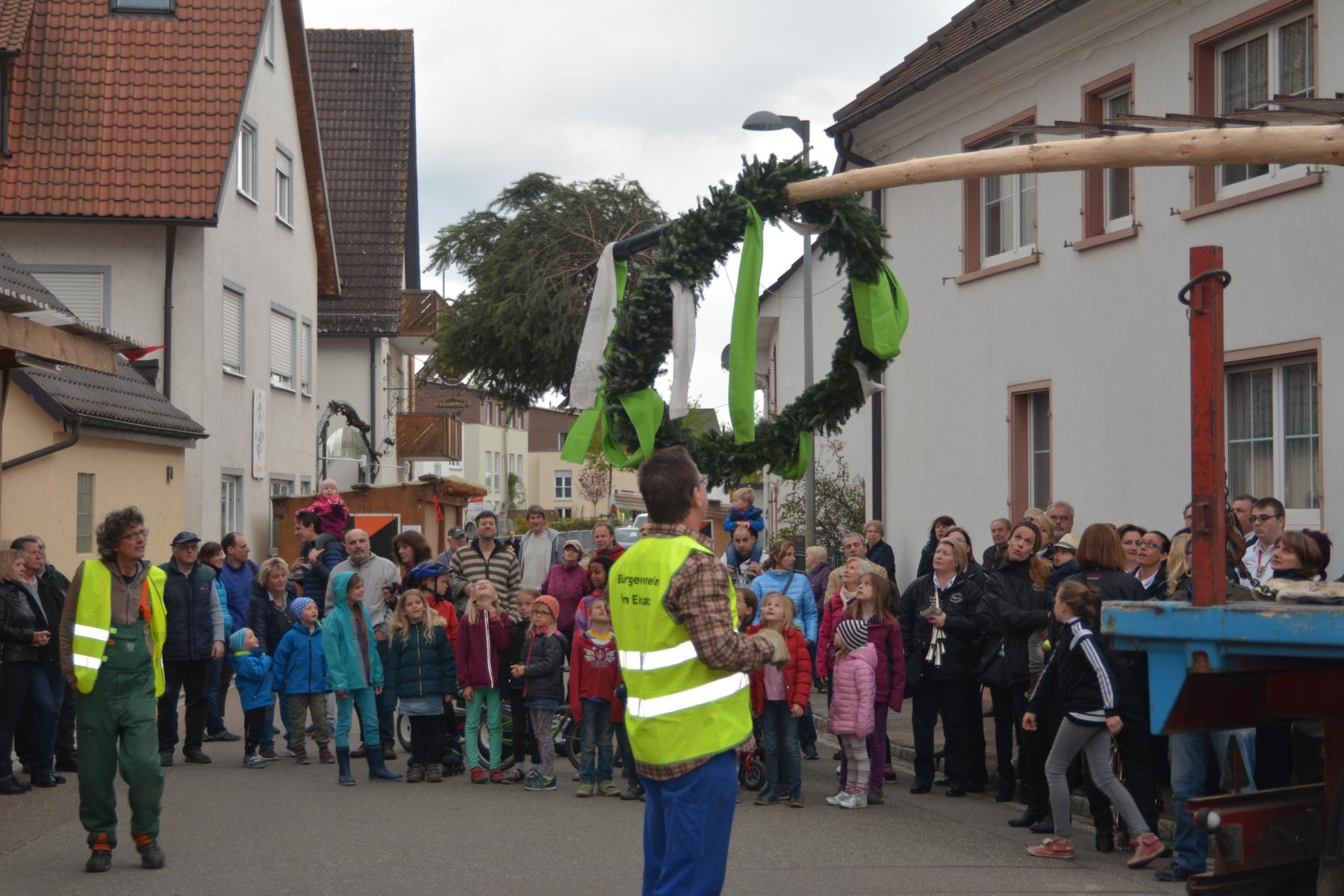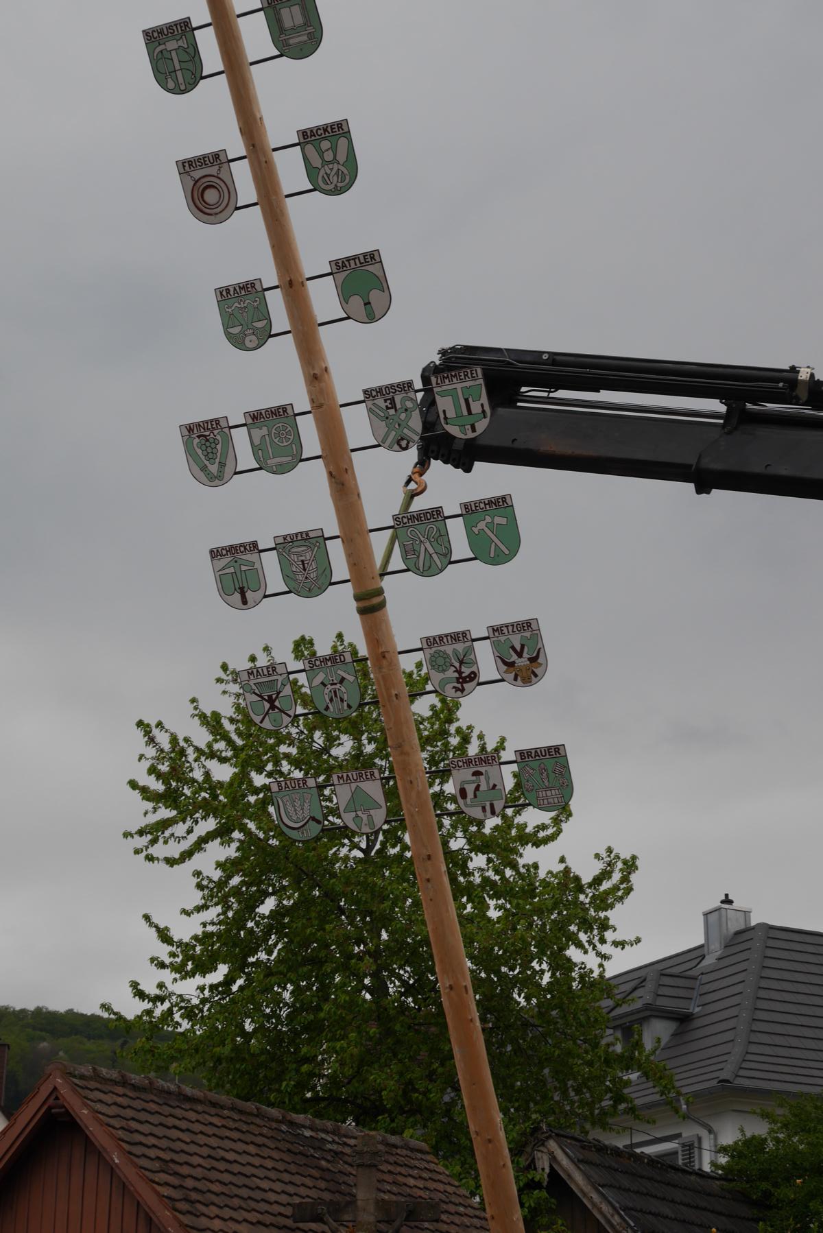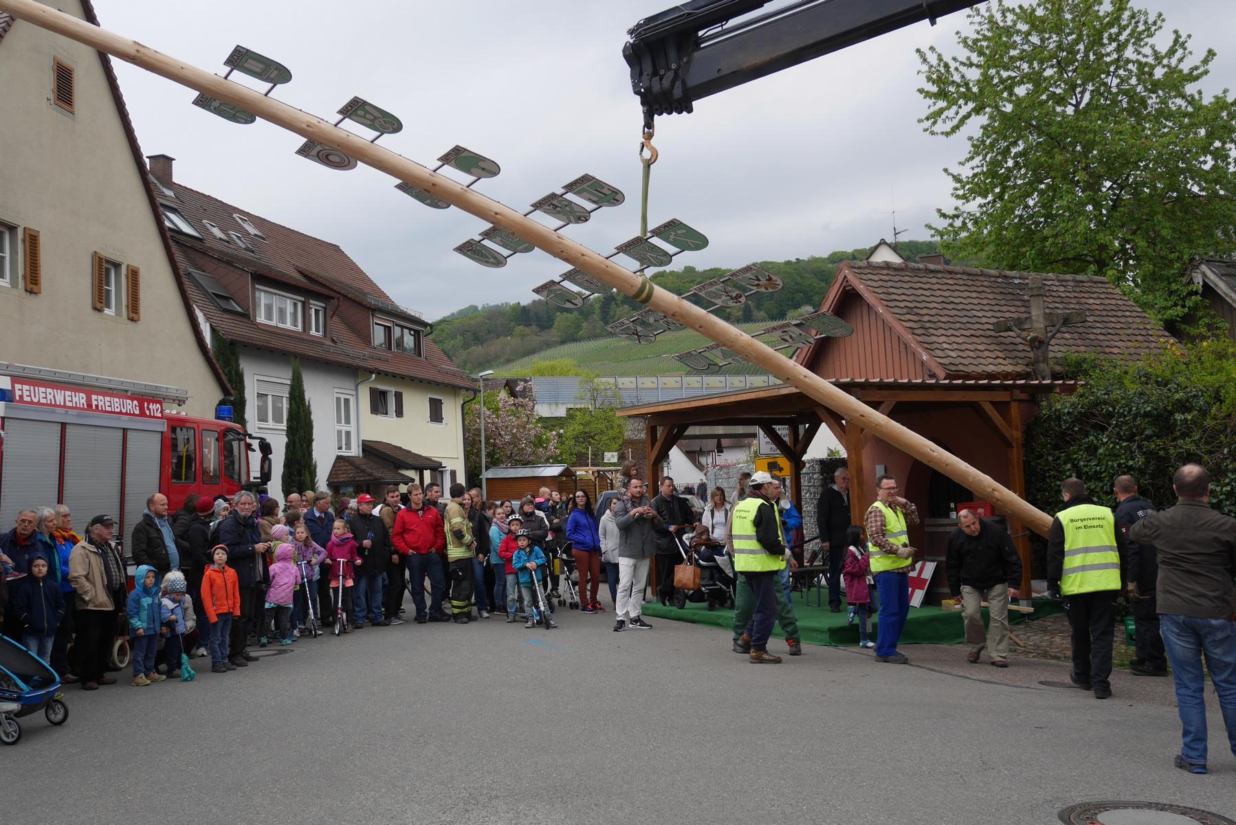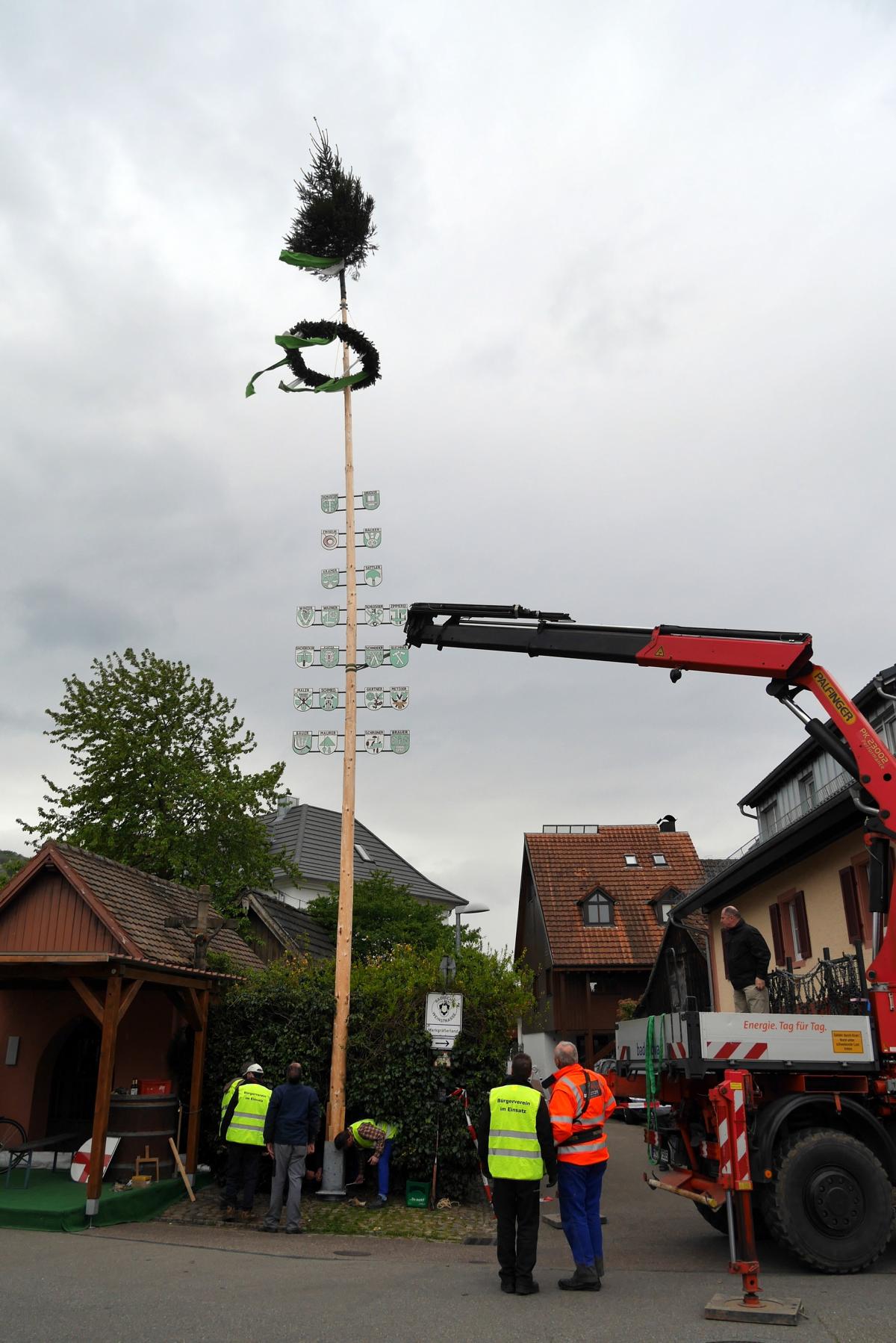 Es ist jedes Jahr wieder eine spektakuläre und spannende Aktion, bis der Maibaum an seiner gewohnten Stelle neben der Marienkapelle aufgestellt ist und ganz Wendlingen und St. Georgen überragt! Fast 20 m lang war der frisch geschlagene Baum, der entrindet wurde und dann, geschmückt mit Girlanden vom Blumenhaus Präg, dem Kranz und den traditionellen Handwerkerwappen, von vielen Helfern aufgestellt wurde. Klaus-Peter Temmes von der AG Ortsbild des Bürgervereins musste vom Fällen des Baumes, über den Transport bist zum anschließenden Aufrichten viele Arbeitsschritte koordinieren, bis man den Maibaum über den Dächern der Langgasse sehen konnte. Schon der Transport mit dem Langholzwagen war sehenswert, den Michael Eck vor die Marienkapelle manövrierte. Dieses Jahr kam der lange Stamm an den Haken des Badenova Großbaggers, der den Baum sehr langsam und gut gesichert über die Köpfe der vielen Zuschauer gleiten ließ. Die Sicherheitsmaßnahmen waren selbstverständlich hoch und das Publikum weit von jeder Gefahrenquelle – dennoch wurde es in diesem Augenblick ruhiger unter den Zuschauern und man konnte die Spannung des Moments fühlen.