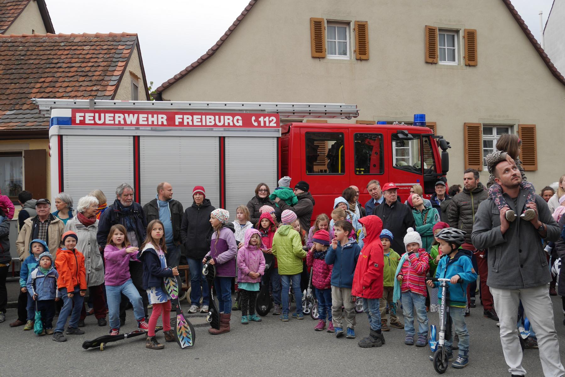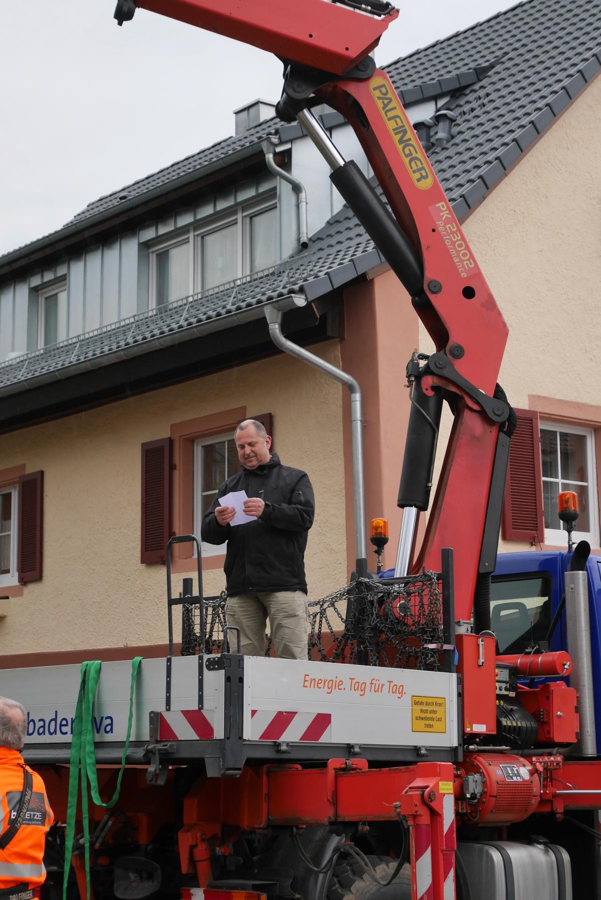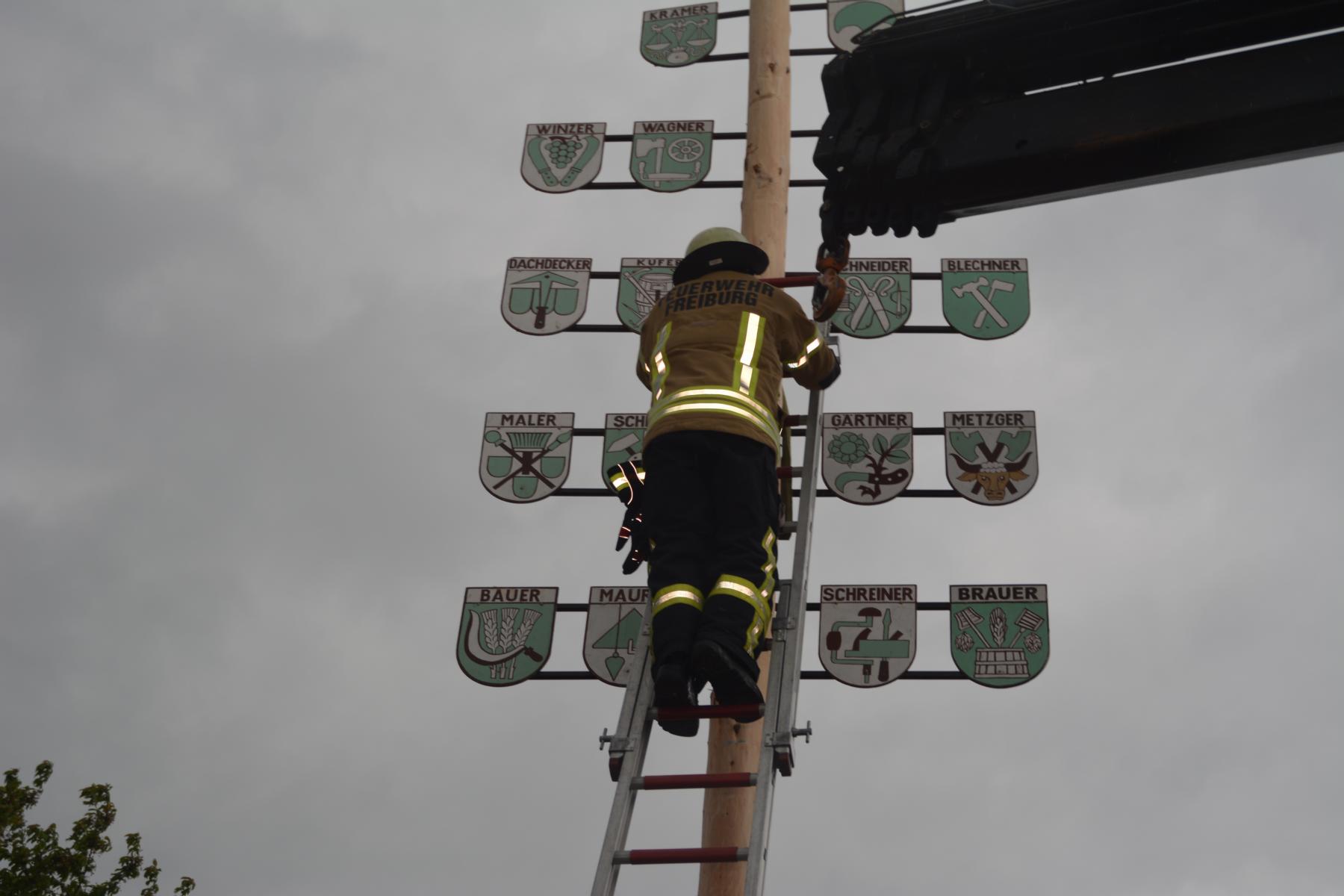 Gar nicht so leicht ist es, den schlanken Stamm in seine feste Halterung einzupassen, und wie jedes Jahr konnte sich der Bürgerverein auf seine freiwilligen Helfer und Vorstandsmitglieder verlassen. Neben Klaus Peter Temmes und Michael sahen die interessierten Zuschauer Lothar und Martin Maier in Aktion, wie auch Manfred Vögele, der die AG Schönberg im BV repräsentierte und als Mitglied der Freiburger Feuerwehr vor Ort war. Und die Feuerwehr war es auch, die, eine lange Leiter an den Stamm gestellt, mit dem Lösen des sichernden Bindeglieds zwischen Bagger und Baum den erfolgreichen Schlusspunkt der Aktion setzte – der Maibaum war gestellt! In seiner Ansprache begrüßte der Vorsitzende des BV, Herbert Bucher, alle Anwesende und dankte allen, die an der Aufstellung des diesjährigen Maibaumes beteiligt waren. Es ist immer toll, wenn der Baum steht und wie oft sieht man den logistischen Aufwand, der dahinter steht, nur in geringem Maße.