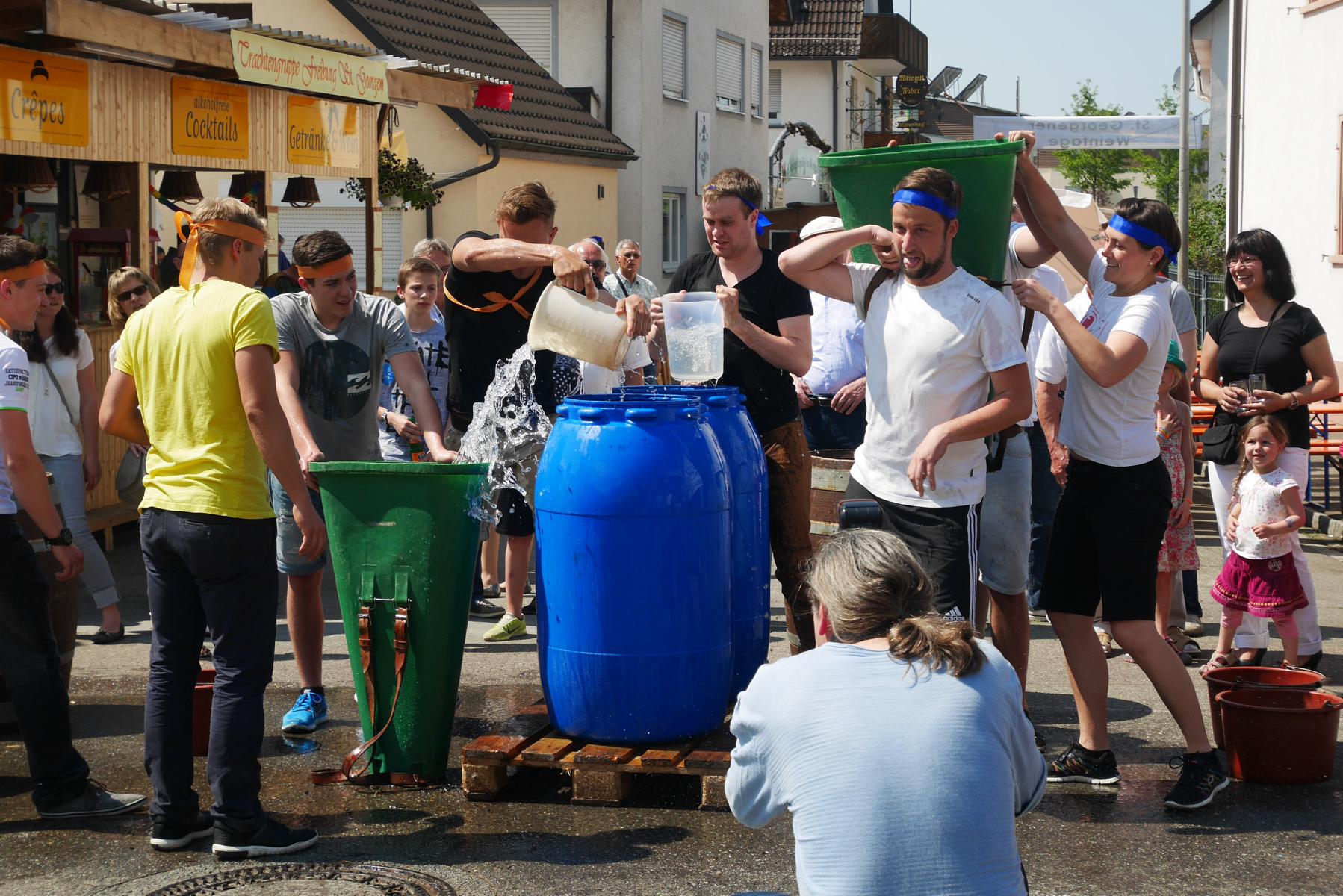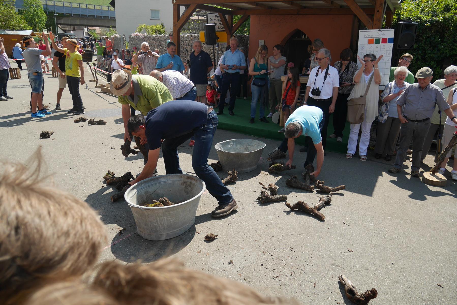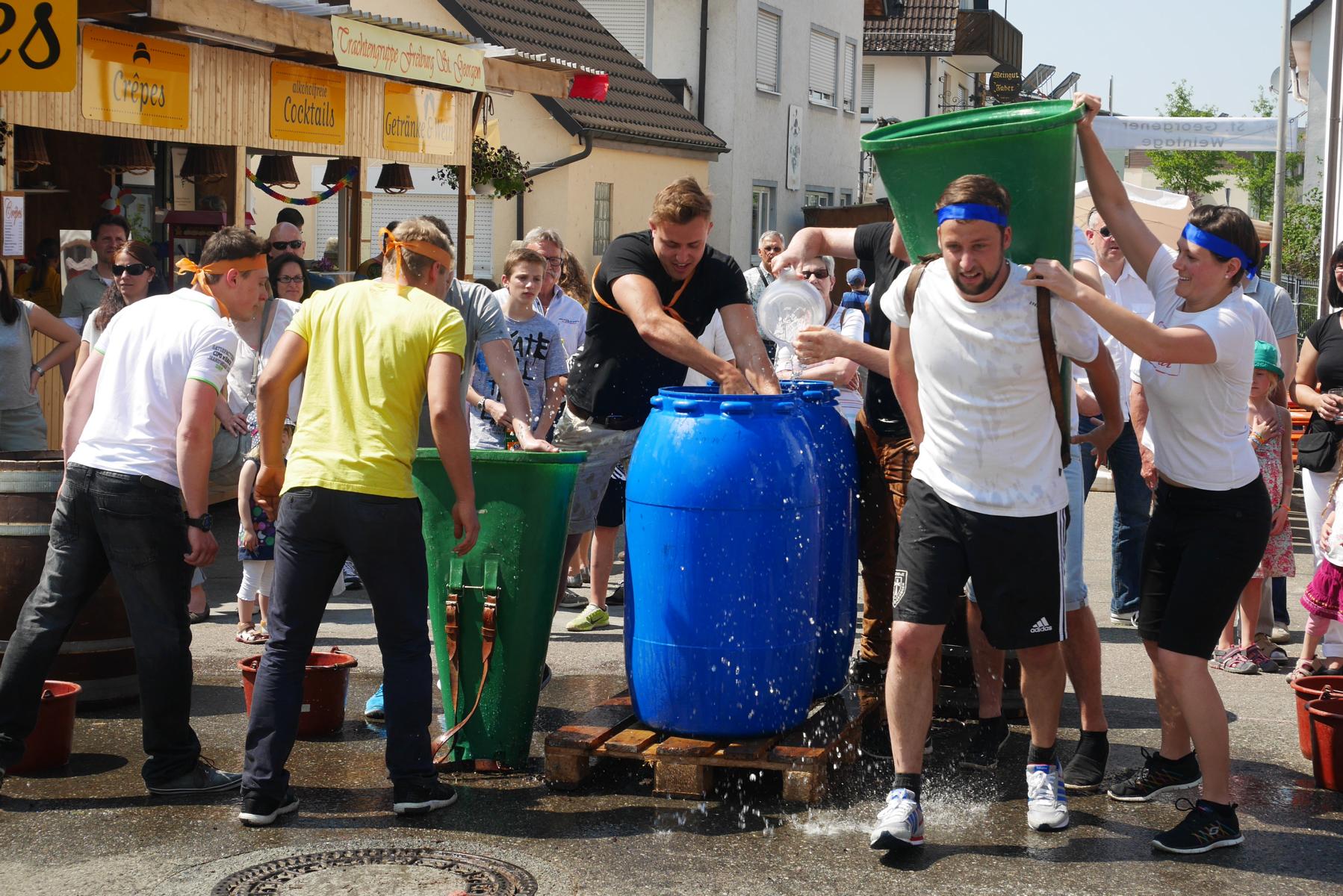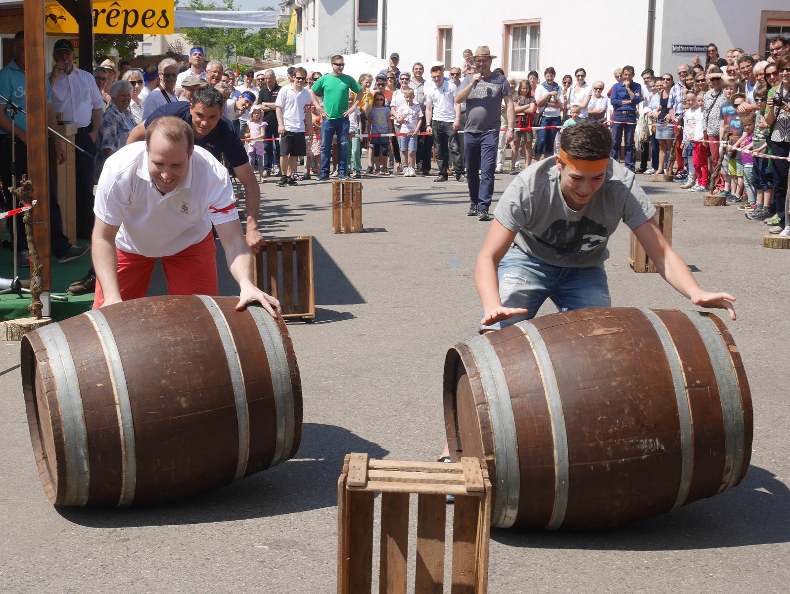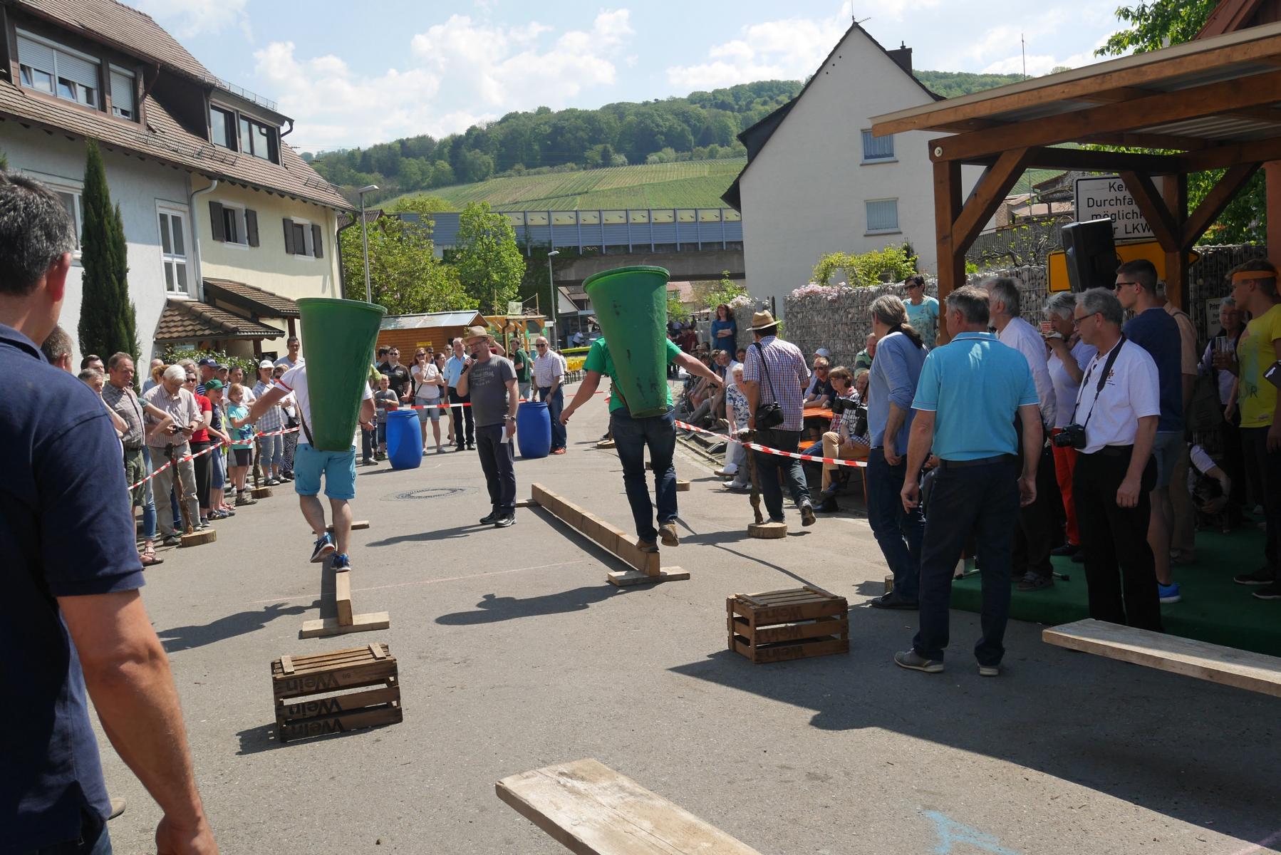 Die Mitglieder der vier Gruppen mit Namen Gutedel, Spätburgunder, Müller-Thurgau und Weißburgunder kämpften mit vollem Einsatz um jeden Punkt. Beim ersten Wettbewerb musste ein Holzfass über einen Slalomparkcour um Holzkisten gelenkt werden. Nicht leicht, besonders wenn man in einen fassartigen Gegenverkehr kommt.