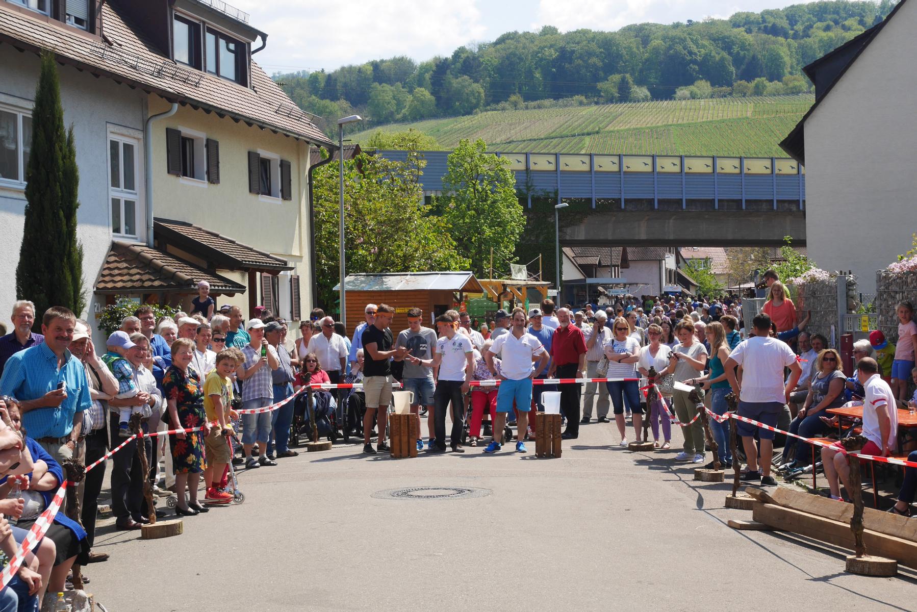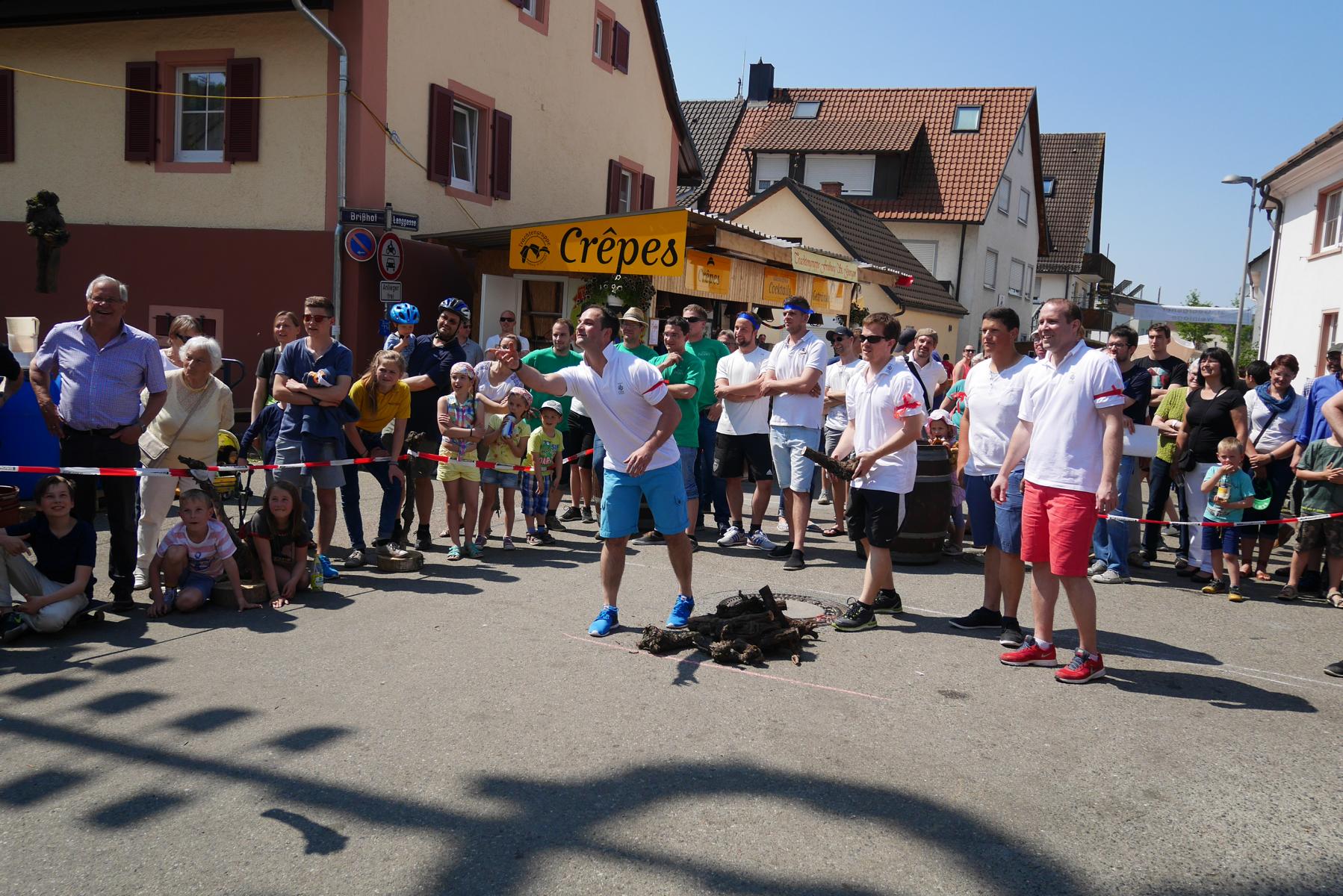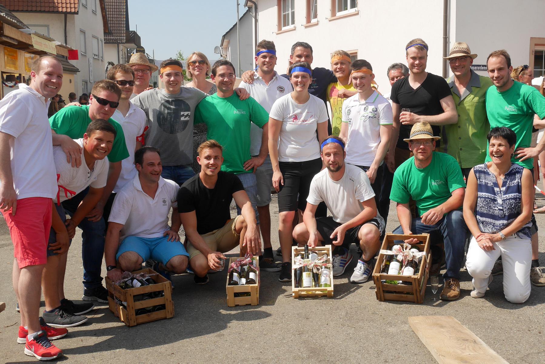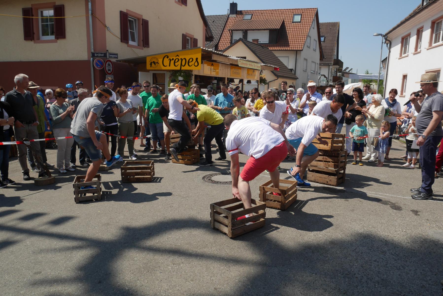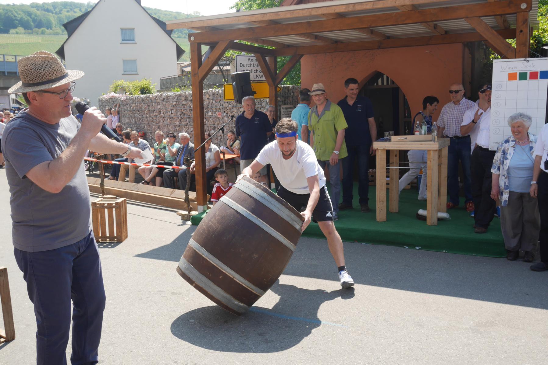 Die Mitglieder der vier Gruppen mit Namen Gutedel, Spätburgunder, Müller-Thurgau und Weißburgunder kämpften mit vollem Einsatz um jeden Punkt. Beim ersten Wettbewerb musste ein Holzfass über einen Slalomparkcour um Holzkisten gelenkt werden. Nicht leicht, besonders wenn man in einen fassartigen Gegenverkehr kommt.