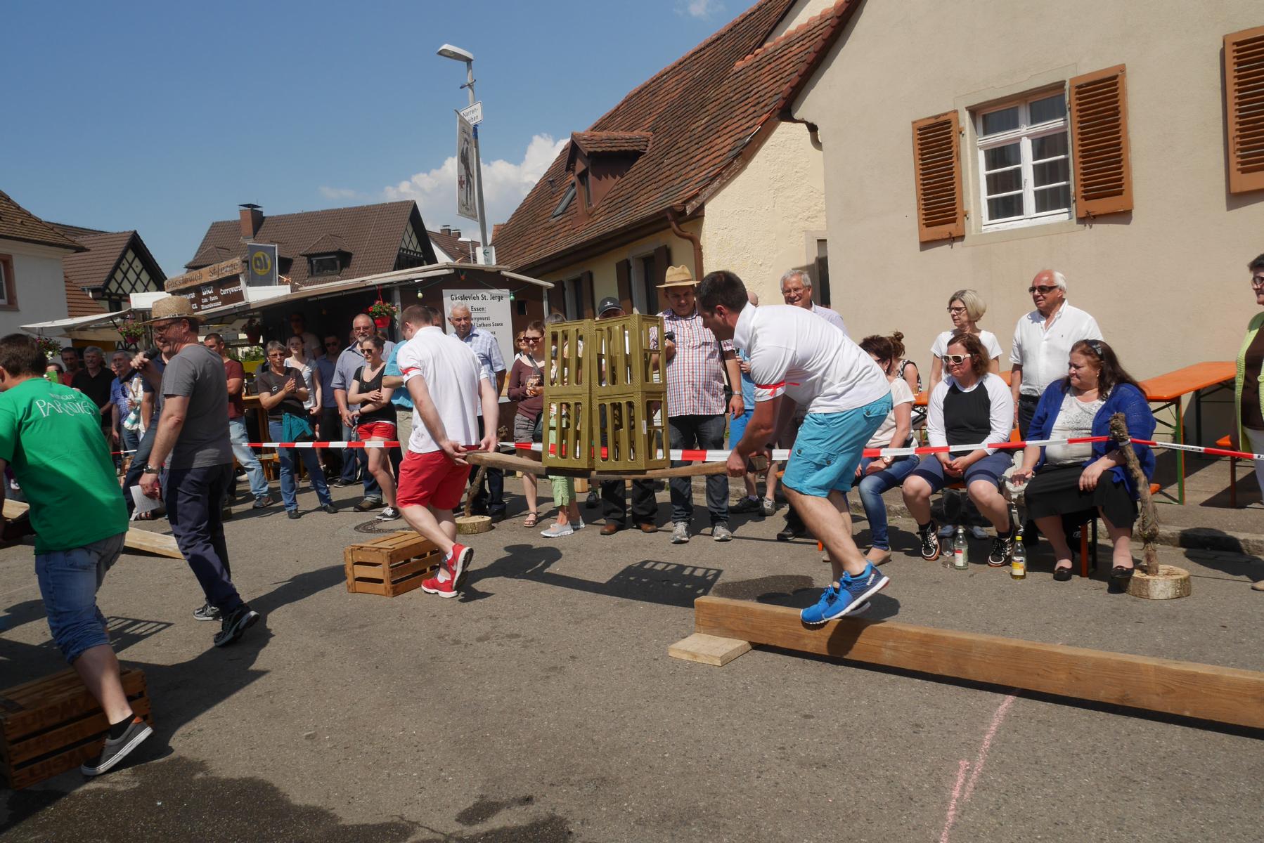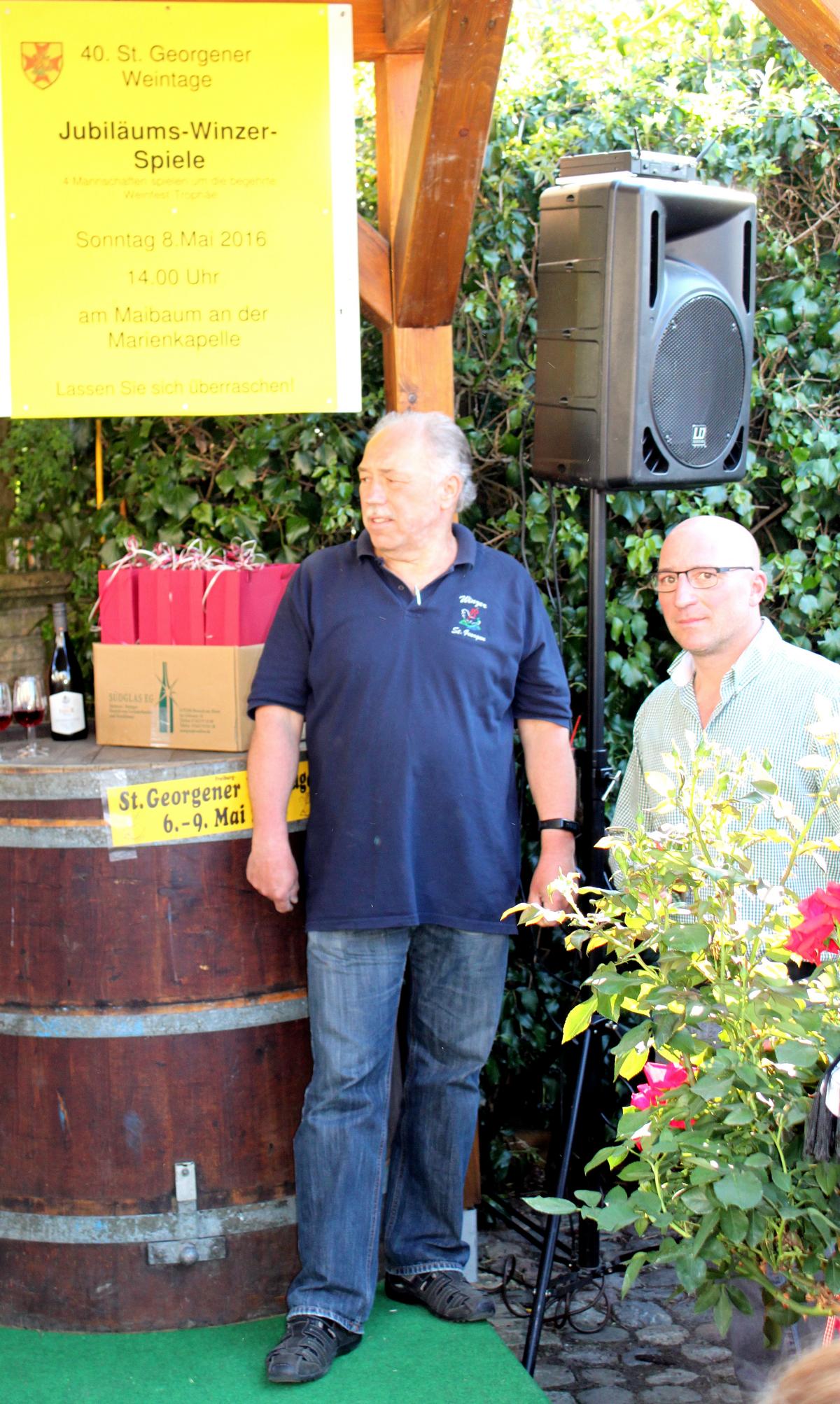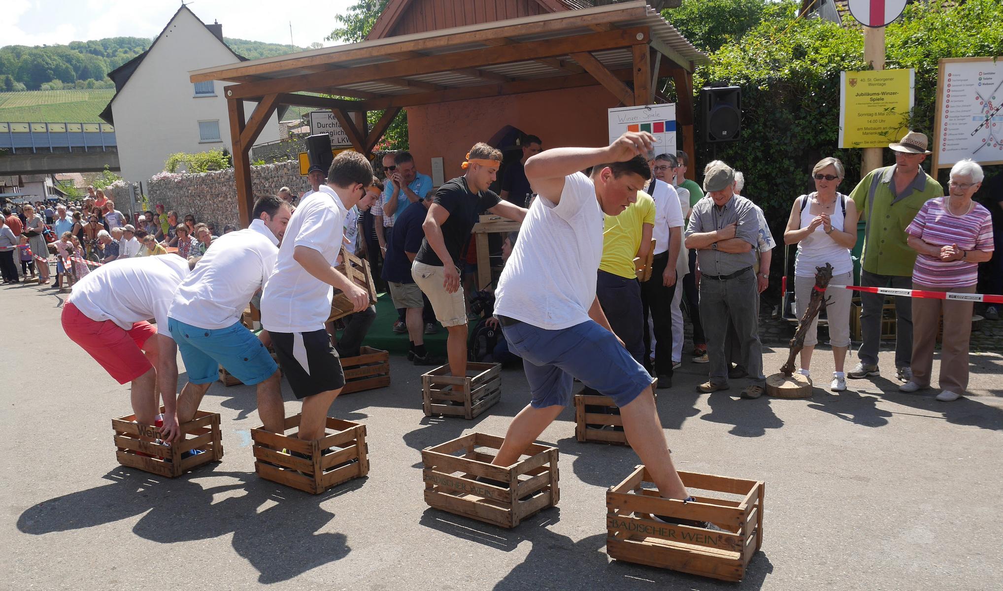 Unter blauem Himmel und kräftiger Sonne fanden sich viele Zuschauer auf dem Platz vor der Marienkapelle ein, die neugierig und gespannt waren, was es mit den Jubiläumsspielen auf sich hat. Die St. Georgener Winzer und Weinbautreibenden hatten sich den Wettbewerb ausgedacht und waren alle als Organisatoren vor Ort. Es war ein längliches Areal abgesperrt, das einen Parcours umrahmte mit vielen Alltagsdingen, die man in einem normalen Weinbaubetrieb findet wie Weinkisten, Bretter, große Bottiche, kleine Eimer, alte Rebstöcke und Holzfässer. Martin Maier präsentierte sich als Moderator und Wettbewerbsleiter, der die Teilnehmer und das Spiel vorstellte.