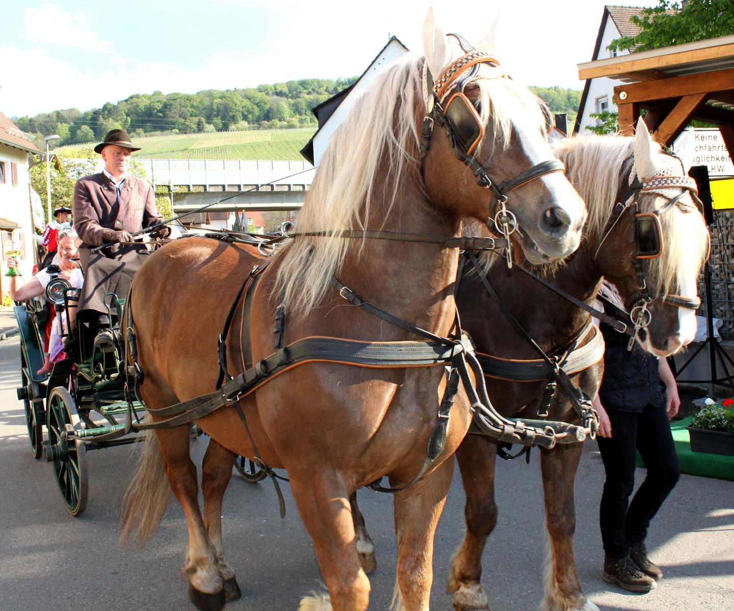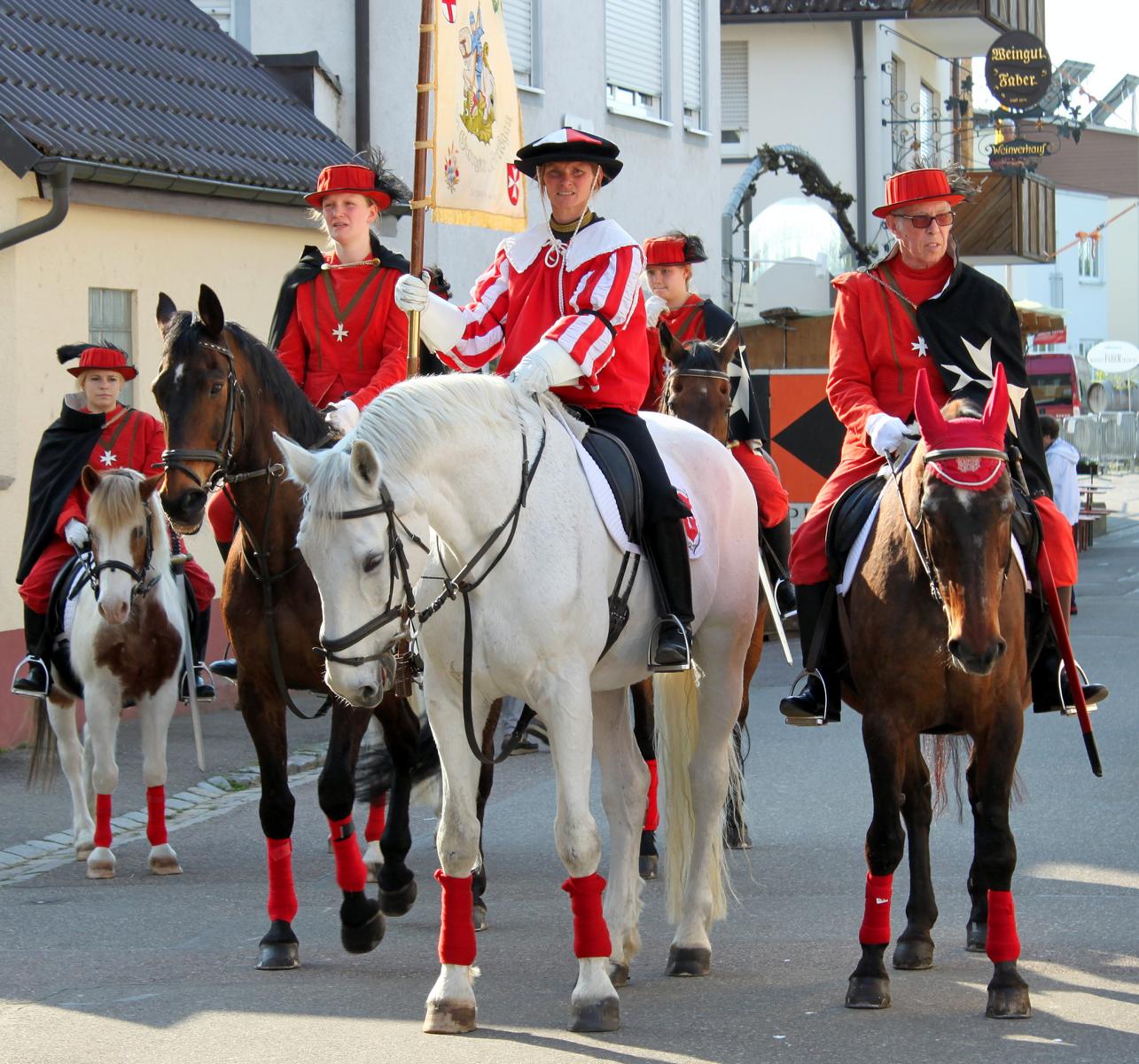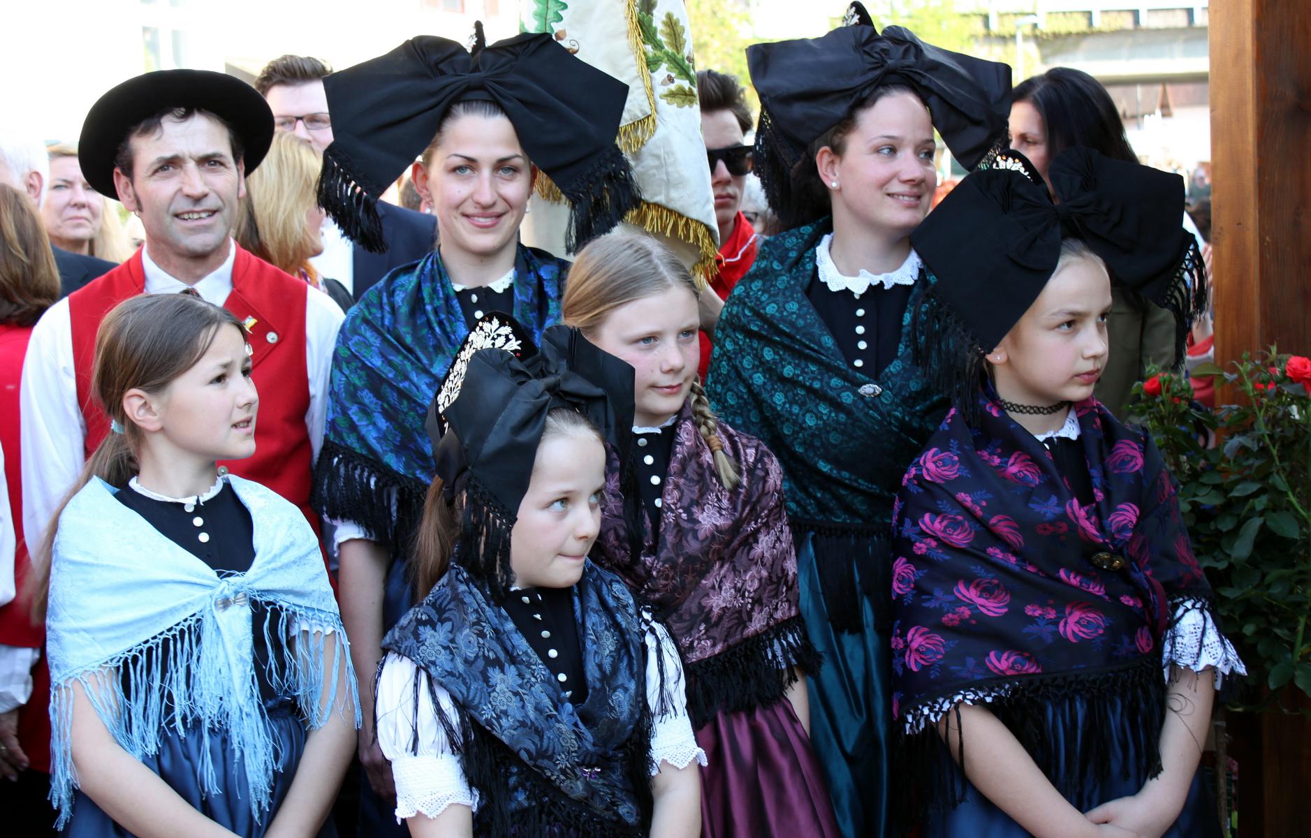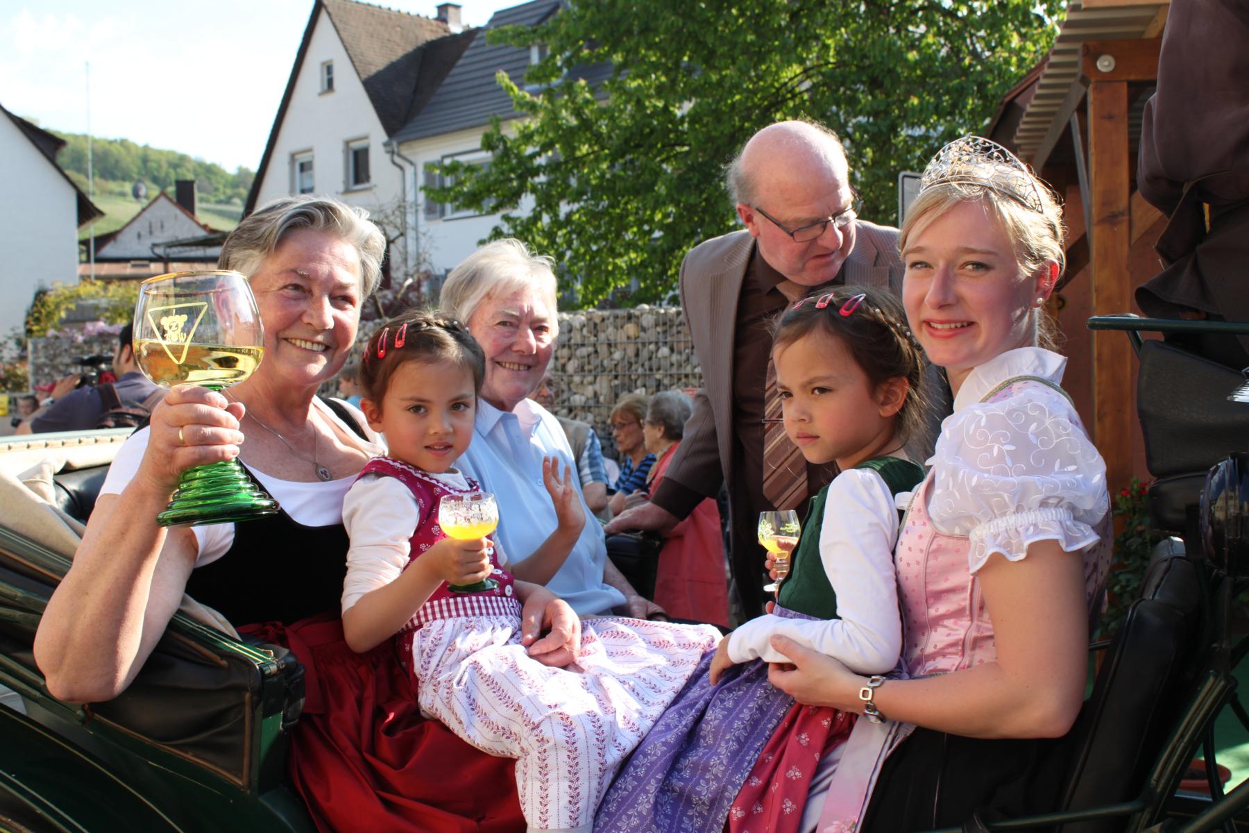 Angeführt wurde der Festzug von den eindrucksvollen Malteserreitern, die musikalische Begleitung bot der Musikverein, an die sich, hoheitlich standesgemäß, die Kutsche mit den weiblichen Majestäten anschloss. So saßen die beiden ehemaligen badischen Weinprinzessinnen Cilly Danner und Gertrud Landmann bequem in den Polstern ihrer Kutsche, umrahmt vom jungen „Hofstaat“. Durch die Menge des wartenden Publikums und der anwesenden Ehrengäste fuhr man gemeinsam mit der amtierenden badischen Weinkönigin Isabella Vetter aus Bleichheim auf den Platz vor der Marienkapelle. Mit Oberbürgermeister Dieter Salomon, dem Vorsitzenden des Bürgervereins Herbert Bucher und Kilian Schneider, Präsident des badischen Weinbauverbandes, umrahmt von hübschen Trachtenträgerinnen, fanden sich auf dem Podest alle ein, die nötig waren, um das erste große Weinfest des Jahres feierlich zu eröffnen. Normalerweise, so OB Salomon, hätte er sich bei seinen Eröffnungsreden in St. Georgen kurz fassen und schnell zum Ende kommen müssen. Immer habe ein Regenguss gedroht. Heute aber könne er wohl so lange reden wie er wolle, und blickte mit gutgelaunter Mine auf den wolkenlosen Himmel. Die St. Georgener hätten auch in diesem Jahr wieder Glück mit dem Wetter, und so erwarte er bei schönem Sonnenschein, dass die Weintage ein gigantischer Erfolg werden. Der Vorsitzende des Bürgervereins freute sich in seiner Rede auf die vielen Besucher des Festes. Mit dem Blick auf die anwesenden Weinhoheiten aus fast jedem Jahrzehnt bemerkte Herbert Bucher, dass man hier sowohl die Vergangenheit wie die Gegenwart des badischen Weinbaus vor Augen habe und man sich um die Zukunft auch keine Sorgen machen müsse.